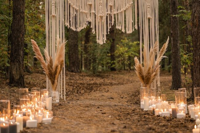 Boho weddings are known to be more rustic and outdoorsy, so pick a location that leans more toward tradition than elegance. There are no limits to your imagination, so feel free to add more untamed trees and foliage, as well as rustic décor accents.